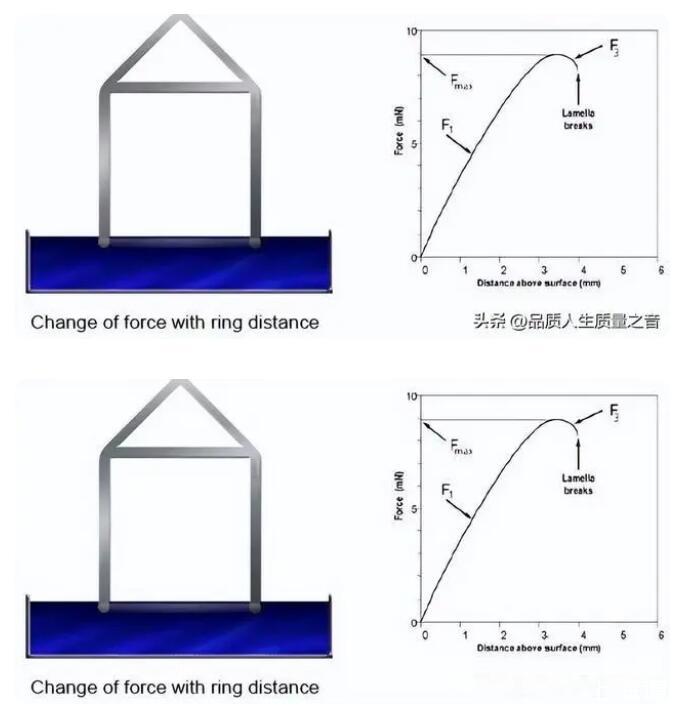 由于距離不同表現(xiàn)出的表面張力也不同,因此測量往往取最大值,也就是右方圖中的Fmax