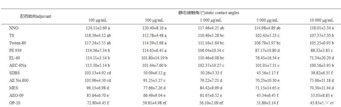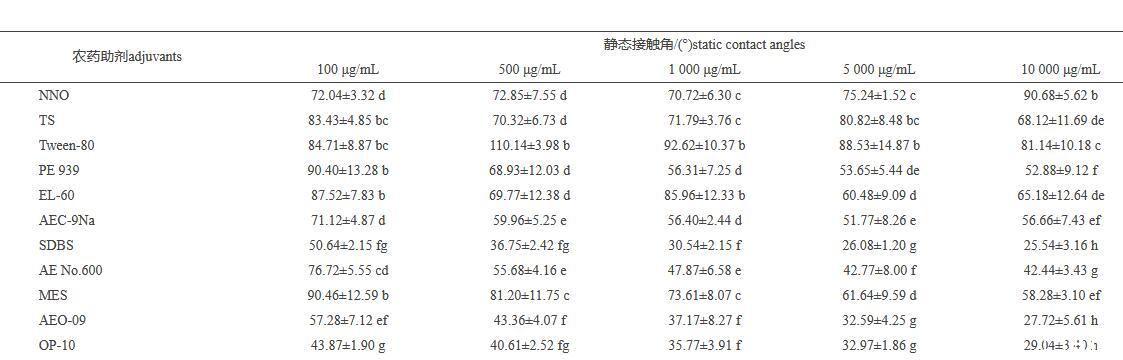 表3不同質(zhì)量濃度的助劑溶液在小麥葉正面上的靜態(tài)接觸角(mean±SD,n=5)