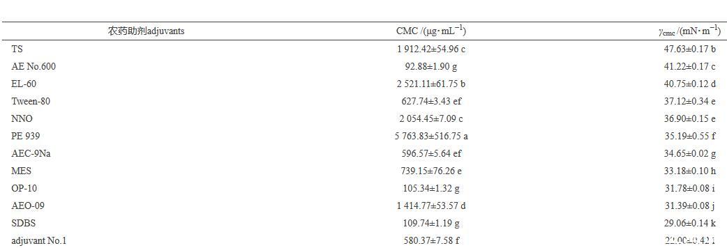 表2不同助劑的臨界膠束濃度及其對應(yīng)表面張力(mean±SD,n=5)