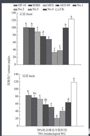 圖3助劑對藥液在小麥葉正、反面靜態(tài)接觸角的影響