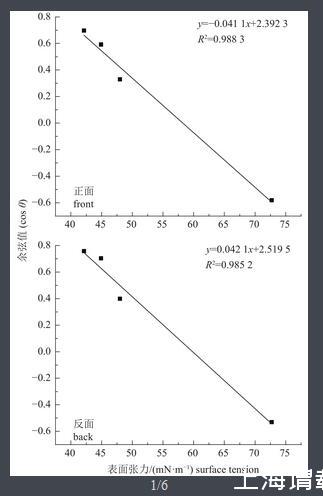 臨界表面張力是固—液界面化學(xué)中表征固體表面能的一個重要指標,用以說明液體在固體表面的可潤濕性。通過ZISMAN圖法[22]以接觸角的cosθ對液體表面張力作圖得到接觸角與表面張力的回歸直線如圖1所示:求得方程分別為y=?0.041 1 x+2.392 3和y=?0.042 1x+2.519 5。將圖中直線外延至cosθ=1處,得出小麥葉片正、反面的臨界表面張力值分別為33.88和36.08 mN/m,與顧中言等[21]研究結(jié)果幾乎一致。從測定結(jié)果可以看出:小麥葉片的反面表面張力值比正面大,更容易被潤濕;但小麥葉片正、反面的表面張力估值較小,即表面自由能較低,較難被潤濕。