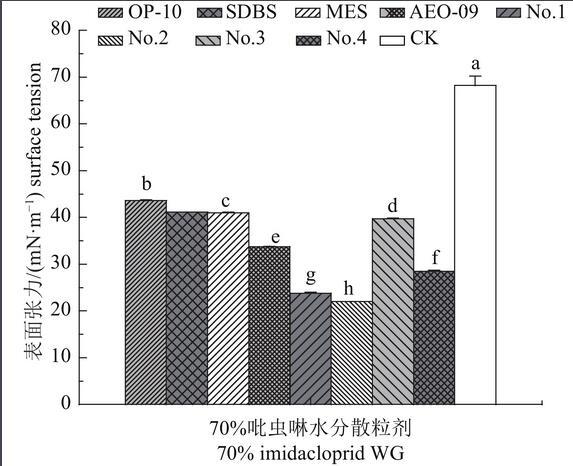 表面張力的大小直接決定了農(nóng)藥制劑在稀釋后能否完全潤濕展布在植物表面上,而降低表面張力的常用方法就是在制劑中添加助劑。本次試驗通過添加不同助劑測定了供試農(nóng)藥表面張力值的變化,結(jié)果如圖2所示。70%吡蟲啉WG藥液的表面張力值為(68.21±2.03)mN/m,加入助劑后顯著降低了藥液的表面張力,且不同助劑對同一種藥液的表面張力降低趨勢存在顯著差異。其中,篩選出的8種助劑中,助劑1#和2#對藥液表面張力下降趨勢最大,效果最好,降低率分別可達65.13%和67.78%;其次是助劑4#、助劑3#、AEO-09和SDBS,降低率范圍在32.84%~63.96%;脂肪酸甲酯磺酸鈉和OP-10較差,但降低率也可達26.58%以上。加入助劑1#、2#和4#后,藥液的表面張力降低至小麥葉片正面的臨界表面張力(33.88 mN/m)以下,能較好潤濕展布在小麥的葉片正、反面上,極大地增加施藥效果。