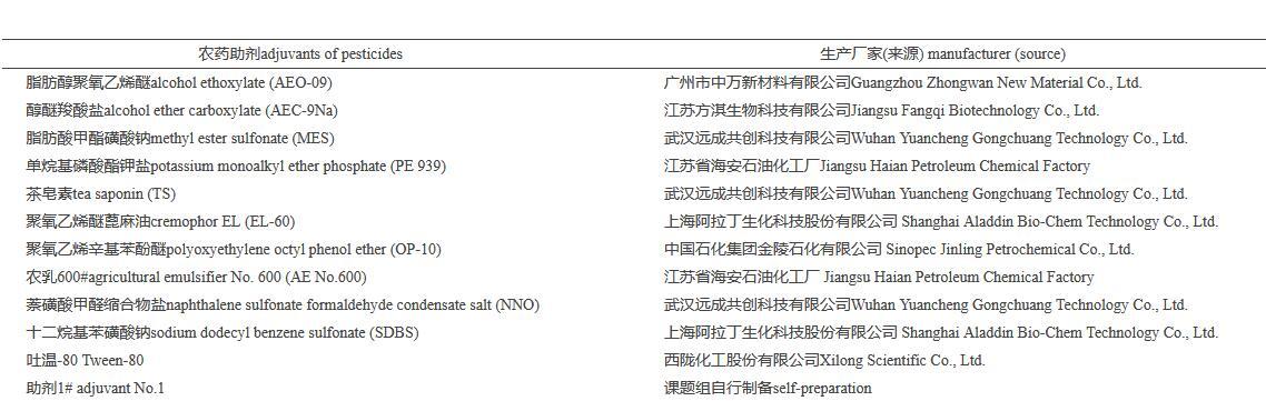 早在1942年ZIMMERMAN發(fā)現(xiàn)了加入助劑的除草劑可以大大提高葉面除草劑的活性,引起了人們廣泛的關(guān)注。隨后,助劑在農(nóng)藥中的作用得到廣泛應(yīng)用,其用量急劇增加[9]。助劑憑借其特殊的性能,在大多數(shù)農(nóng)藥中起著潤濕、分散、乳化和促溶等作用,大大降低了溶液的表面張力,增強了藥劑在植物或害蟲體表的潤濕、鋪展以及附著力,提高了農(nóng)藥的藥效,減少了農(nóng)藥的用量,并對農(nóng)藥劑型的穩(wěn)定性產(chǎn)生重要影響[10-14]。實際上,大量研究發(fā)現(xiàn):多數(shù)使用的農(nóng)藥藥劑在其推薦劑量下藥劑中的助劑未達到臨界膠束濃度(CMC),或者達到CMC但其表面活性較差,均不能很好地潤濕和展布在靶標植物葉面上,尤其是疏水性強植物水稻、小麥等,造成藥滴的滾落和流失,降低利用率,污染靶標植物田塊的生態(tài)環(huán)境[15-18]。故合理選擇和使用助劑增加藥液潤濕展布性和在葉片的滯留能力,減少藥液流失,提高農(nóng)藥利用率,減少麥田農(nóng)藥用量,對農(nóng)田資源可持續(xù)利用及安全生產(chǎn)具有重要的意義。