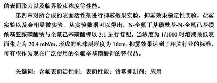 第四章對所合成的表面活性劑進(jìn)行抑霧效果實驗,抑霧效果穩(wěn)定性實驗,鹽霧實驗以及金相顯微實驗。從實驗數(shù)據(jù)可以得出,N-全氟丁基磺?;?N-全氟己基磺酰基亞胺磺酸鈉與全氟己基磺酸鉀以3:1進(jìn)行復(fù)配,當(dāng)濃度為1/1000時溶液最低表面張力為20.4mN/m,形成的泡沫層厚度為16cm,抑霧效果達(dá)到了相關(guān)行業(yè)的標(biāo)準(zhǔn),可有望作為現(xiàn)在廣泛使用的全氟辛基磺酸鉀的替代品。
