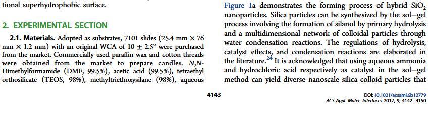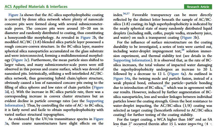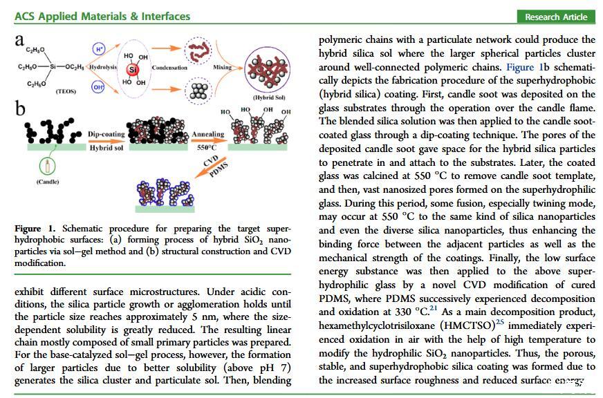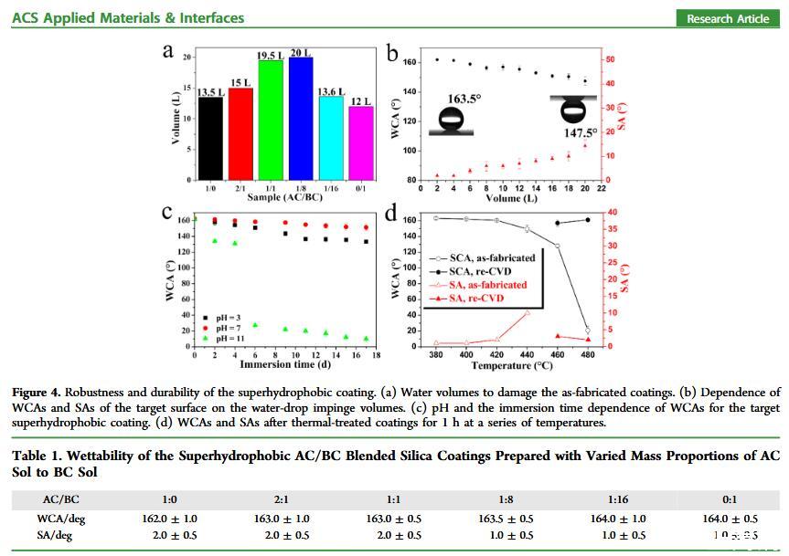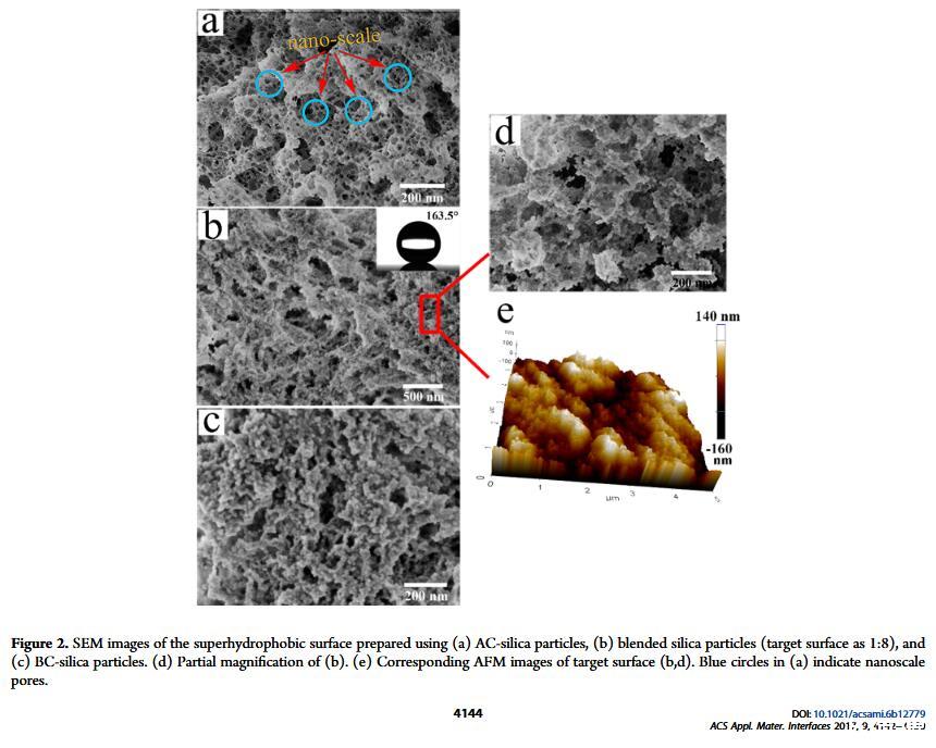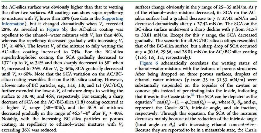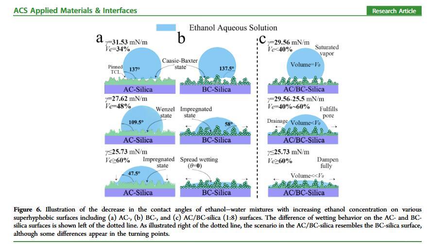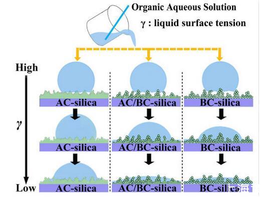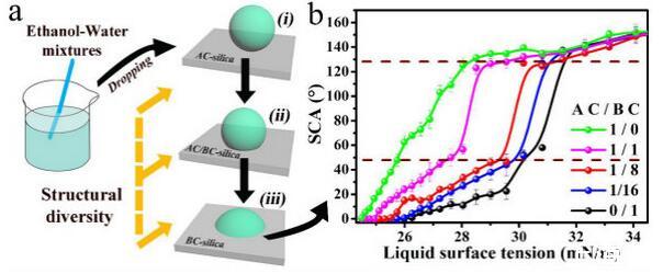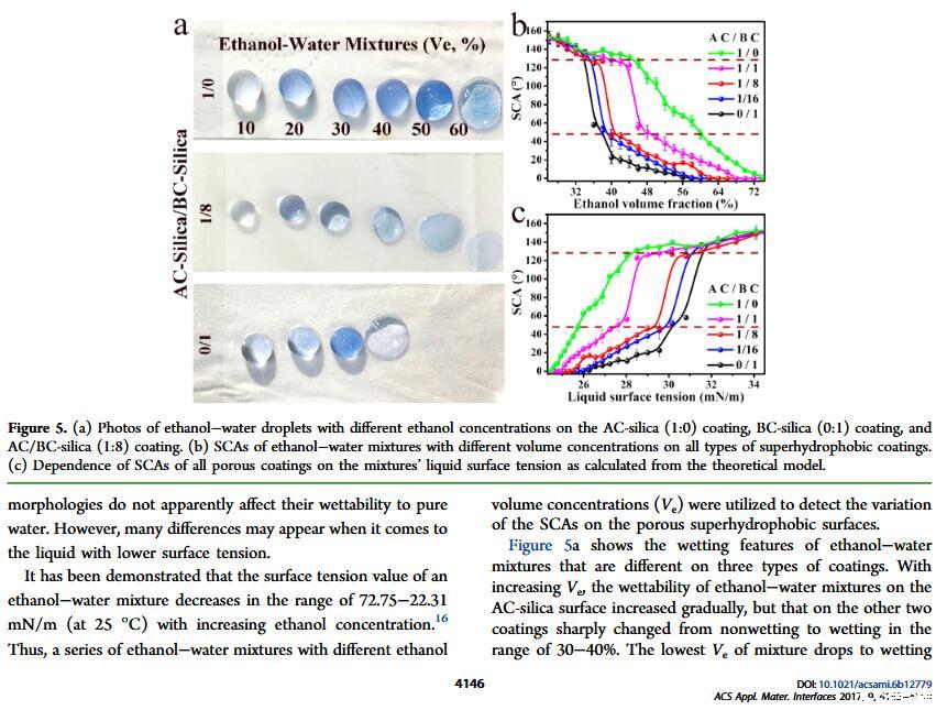 結(jié)果表明,以正硅酸四乙酯為前驅(qū)體通過酸性和堿性水解法制備了不同形貌的納米二氧化硅溶膠,通過混合兩種溶膠可制備出具有顆粒間鍵橋強度高的亞微米級凸起和納米級凹坑的結(jié)構(gòu)的涂層。通過控制酸堿催化溶膠混合比例,我們可以制備出具有不同微觀結(jié)構(gòu)的超疏水涂層。結(jié)果表明具有不同結(jié)構(gòu)的涂層具有不同的潤濕性-表面張力關(guān)系,隨著涂層制備時堿催化溶膠的比重增加,納米級凹坑結(jié)構(gòu)逐漸減少,表面更容易被低表面張力液體侵入,因而接觸角下降更劇烈。并且在有機物水溶液,包括:甲醇、乙醇、正丙醇、異丙醇、乙酸、丙酮、N,N’-二甲基酰胺等,都具有同樣的接觸角和濃度(表面張力)響應(yīng)規(guī)律。