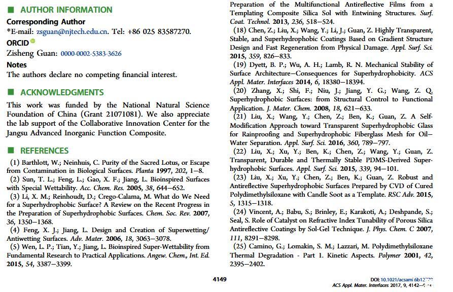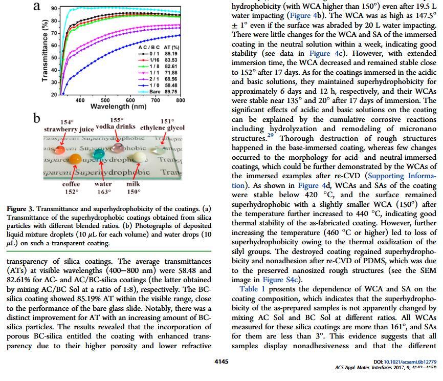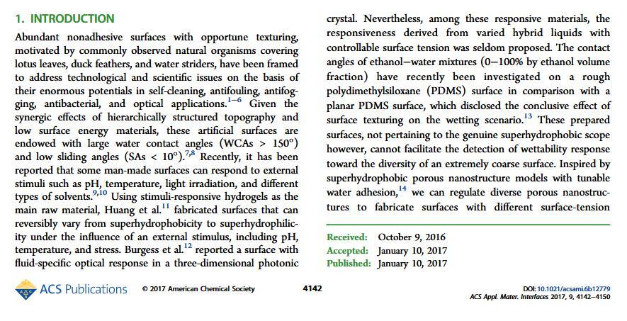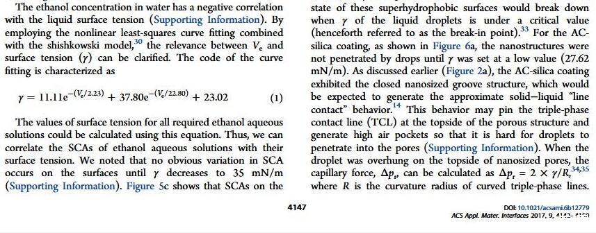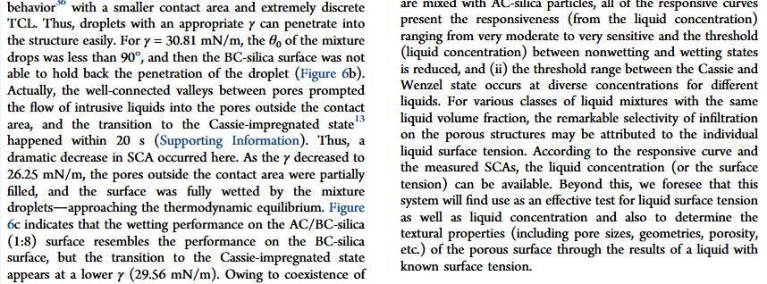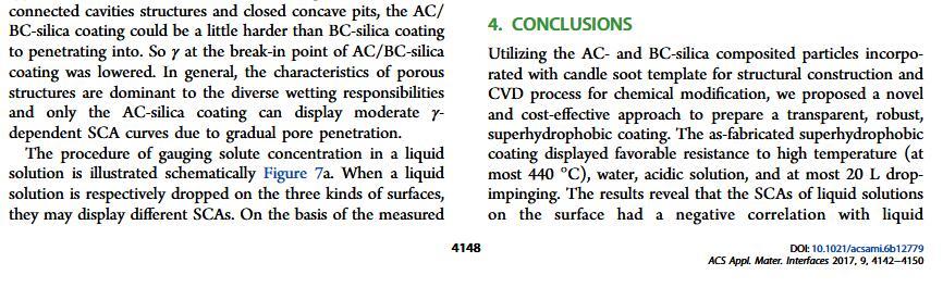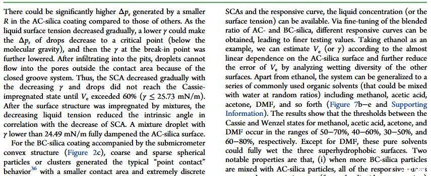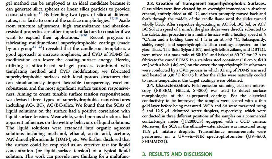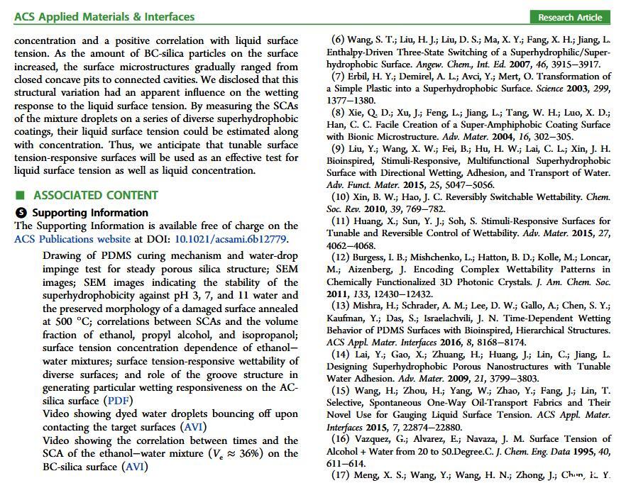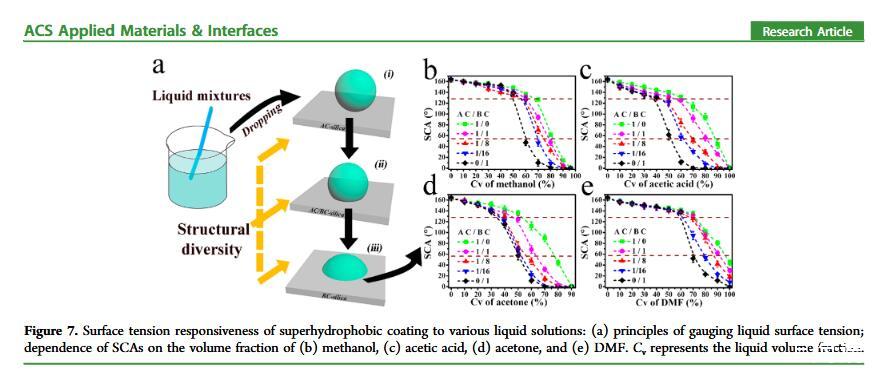 當(dāng)液體的表面張力發(fā)生變化時,它在普通固體表面的潤濕性也會隨著變化。然而,關(guān)于這一規(guī)律以及尤其是在超疏水表面的表現(xiàn)的研究很少。最近,協(xié)同創(chuàng)新中心PI-6管自生老師課題組研究生王研等人利用上述的表面張力和潤濕性的響應(yīng)關(guān)系首次將透明超疏水涂層應(yīng)用在探測液體表面張力方面,為拓寬多功能超疏水涂層的應(yīng)用提供了一個新的思路,相關(guān)論文已被ACS applied materials&interfaces發(fā)表。研究表明,隨著有機物水溶液中有機物體積分數(shù)上升,溶液的表面張力相應(yīng)地下降,溶液液滴在制備的超疏水涂層的接觸角也逐漸下降,此稱之為表面潤濕性對表面張力的響應(yīng)?;诖隧憫?yīng)關(guān)系,可以通過接觸角估測液體的表面張力以及有機物的濃度。