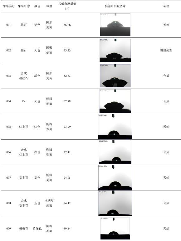 本文運用現(xiàn)代儀器(FTA200動態(tài)接觸角測量儀)測量了15個天然和合成寶玉石品種(鉆石、合成碳硅石、合成立方氧化鋯、碧璽、托帕石、翡翠、琥珀等),以及經(jīng)覆膜和充填2種處理方法的寶玉石樣品(鍍膜鉆石、覆膜托帕石、覆膜翡翠、覆膜琥珀、充填碧璽)的表面接觸角,并運用公式計算其表面張力。