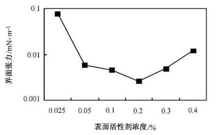 界面張力隨著表面活性劑濃度的增加先減小后略有增加。這是由于表面活性劑在濃度較低時(shí),在油水界面上吸附的分子較少,分子排列不夠緊密且不規(guī)則,界面張力較大;濃度增大時(shí),油水界面上吸附的分子逐漸增多,分子排列變得緊密而整齊,達(dá)到吸附飽和,界面張力急劇下降;繼續(xù)增大表面活性劑的濃度時(shí),在油滴附近開(kāi)始出現(xiàn)膠團(tuán),阻止了部分表面活性劑在油水界面的吸附,界面張力開(kāi)始回升。