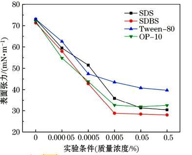 表面張力是影響表面活性劑溶液潤濕性能的重要參數(shù)。設(shè)定所有溶液溫度為25℃,使用表面張力儀對(duì)各溶液在不同質(zhì)量分?jǐn)?shù)下測定其表面張力。實(shí)驗(yàn)共設(shè)置了6個(gè)質(zhì)量分?jǐn)?shù),分別是0、0.000 05%、0.0005%、0.005%、0.05%和0.5%,依次測量各表面張力。