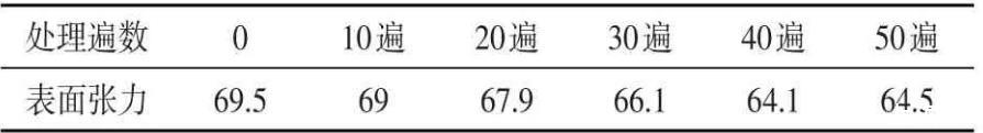 由圖表分析可知,自來水經(jīng)過不同遍數(shù)處理后,其表面張力值均有所下降。磁場強度為1.0 T時,下降幅度范圍為1.0~3.0 mN·m-1。處理50遍時,水的表面張力減小的幅度約為3.1,相對于自來水的表面張力減小了4.5%;當水被處理30遍到40遍時,水的表面張力的下降速率出現(xiàn)明顯減緩的趨勢,水的表面張力僅僅減小了0.1 mN·m-1,相對于水被處理20遍到30遍時表面張力下降值的百分比為12.5%。