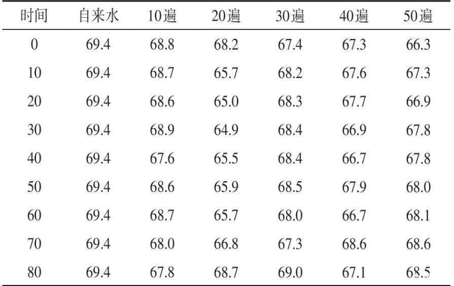 表2磁場強度為1.2 T時磁化水表面張力隨遍數(shù)的變化值mN·m-1