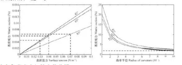圖2基質(zhì)吸力隨表面張力和曲率半徑的變化曲線