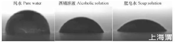 由上式可以看出,基質(zhì)吸力的大小與表面張力、接觸角和曲率半徑有關(guān)。其中,基質(zhì)吸力的大小與表面張力成正比,與彎液面曲率半徑成反比。因此,表面張力和曲率半徑的變化均會(huì)導(dǎo)致基質(zhì)吸力的改變。在環(huán)境溫度為25℃時(shí),通過(guò)JC2000型接觸角測(cè)量?jī)x對(duì)三種試樣的孔隙液體進(jìn)行接觸角測(cè)量。得到三種不同表面張力液滴的幾何形態(tài)圖如圖1所示,測(cè)量可得純水、酒精溶液和肥皂水對(duì)應(yīng)的接觸角分別為85°、65°和42°,而在25℃環(huán)境下,純水、20%酒精溶液、2 g L-1肥皂水的表面張力系數(shù)分別為:7.1×10-2N m-1、4.1×10-2N m-1、2.9×10-2N m-1。表面張力是決定彎液面形狀的主要因素之一,會(huì)影響曲率半徑和接觸角的大小。很顯然,表面張力大的液體接觸角變大,曲率半徑變小。圖1中水滴表面張力大于酒精溶液,但形成的彎液面半徑卻要小于酒精溶液,同樣的,酒精溶液形成的彎液面半徑又小于肥皂水。曲率半徑越小,土體中的基質(zhì)吸力越大。孔隙水表面張力會(huì)對(duì)彎液面的曲率半徑產(chǎn)生改變從而對(duì)基質(zhì)吸力產(chǎn)生影響,最終影響土壤的收縮開(kāi)裂。