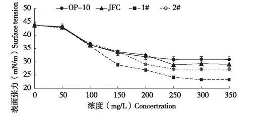 農(nóng)藥制劑噴霧使用時(shí),藥液的表面張力會(huì)影響到藥液在植物葉片上的潤(rùn)濕性能和持留量,很多藥液難以在水稻、小麥和甘藍(lán)葉面濕潤(rùn)展布,是由于藥液的表面張力大于這些植物的臨界表面張力,因此要選用能顯著降低表面張力的表面活性劑,或增加表面活性劑的用量,使藥劑推薦劑量藥液的表面張力值小于水稻的臨界表面張力值,才能有利于藥液在水稻等葉面上的濕潤(rùn)。本研究中發(fā)現(xiàn),2.3%甲維鹽微乳劑在推薦使用倍數(shù)下,對(duì)應(yīng)藥液表面張力43.8 mN/m明顯高于水稻的臨界表面張力36-38 mN/cm,表現(xiàn)為藥液在葉片上難潤(rùn)濕展布,因此本文通過(guò)添加4種助劑來(lái)降低藥液表面張力,當(dāng)藥液表面張力低于靶標(biāo)作物葉面表面張力時(shí),藥液才能在葉面潤(rùn)濕展布,提高噴霧藥液的持留量和鋪展面積,綜合考慮,4種助劑表現(xiàn)最優(yōu)是乳化劑1#,其次是乳化劑2#,然后是JFC,OP-10表現(xiàn)最差。