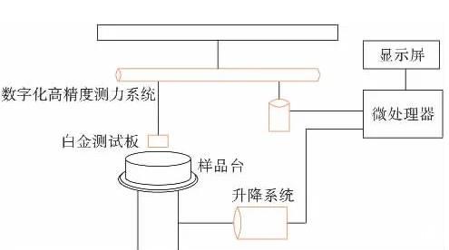圖1為表面張力儀工作系統(tǒng)示意圖。硬件方面主要包括樣品臺、升降系統(tǒng)、數(shù)字化測力系統(tǒng)和微處理器。軟件方面由控制、分析專用軟件經(jīng)過微處理器的一系列運算,將檢測到的微力轉(zhuǎn)化成表面張力值。由LCD數(shù)字顯示屏實時輸出表面張力值,如果需要,可通過RS232接口連接打印機,打印數(shù)據(jù)或經(jīng)計算機采集相應數(shù)據(jù)。該裝置結(jié)構(gòu)簡單,操作簡便,準確性高。