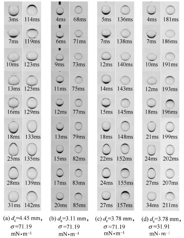 液滴運(yùn)動(dòng)過程中的形狀變化對(duì)液滴的蒸發(fā)、燃燒等過程有重要影響,表面張力是影響其形狀變化的因素之一。為研究表面張力對(duì)液滴形變的影響規(guī)律,采用低濃度的表面活性劑(十二烷基苯磺酸鈉SDBS)配制表面張力為30~72 mN·m?1的水溶液。利用不同外徑的針管得到3~5 mm粒徑的液滴。高速攝像機(jī)(Phantom V211,1000 pps,800×600 pixel)對(duì)這些液滴在自由落體過程中的形變規(guī)律進(jìn)行了可視化實(shí)驗(yàn)研究,得到了關(guān)于E?tv?s數(shù)(Eo)的半經(jīng)驗(yàn)關(guān)系式。實(shí)驗(yàn)結(jié)果表明,液滴在自由落體過程中會(huì)形成周期性振動(dòng)形變,振動(dòng)周期和振幅隨表面張力增大而減小。進(jìn)一步研究發(fā)現(xiàn),初始時(shí)液滴形成并斷裂所引起的瞬態(tài)沖量使液滴內(nèi)部動(dòng)量傳遞進(jìn)而表現(xiàn)出周期性振動(dòng)形變。