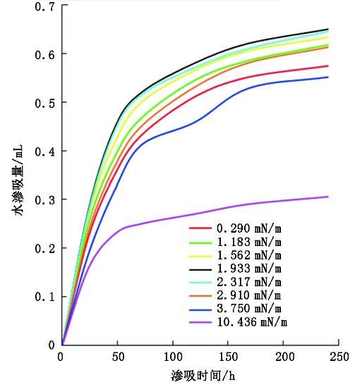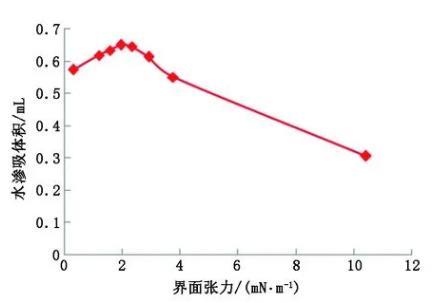 圖2界面張力對最終水滲吸體積的影響(試驗(yàn)結(jié)果)