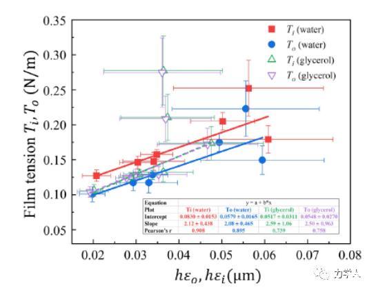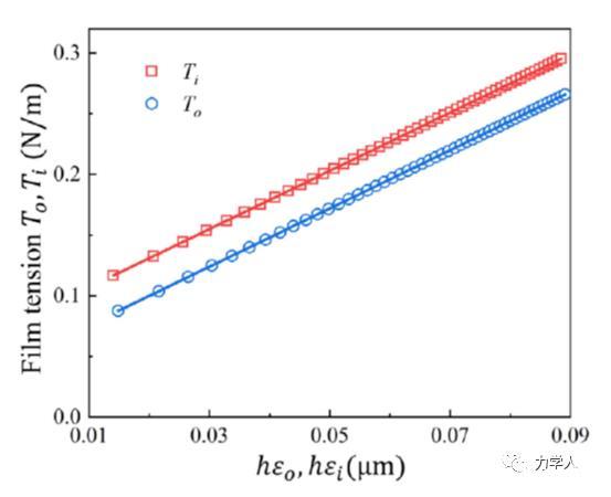 基于該平衡構(gòu)型的解析解,本研究發(fā)現(xiàn)薄膜在接觸線附近的彈性應(yīng)變可以由薄膜的鼓包角解析給出。由此,本文給出了在一般條件下,薄膜在接觸線附近的彈性應(yīng)變隨鼓包角的解析關(guān)系。圖3表明,基于該解析關(guān)系給出的薄膜彈性應(yīng)變可以很好的描述薄膜總張力隨薄膜厚度及接觸線附近應(yīng)變的演化規(guī)律?;诖耍疚奶岢隽瞬捎镁€性外推薄膜總張力隨薄膜厚度和接觸線附近薄膜應(yīng)變乘積的方法來確定固體表面張力的方案。