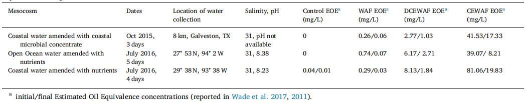 海水是從墨西哥灣收集的,用于填充 12 罐,每個 130 L,其中 4 個處理一式三份: 對照(海水)、WAF(用 Macondo 替代油,一種輕質(zhì)低硫原油,化學(xué)性質(zhì)類似于 在深水期間從 Macondo 井中溢出的石油 Horizon 事件)、CEWAF(Corexit + oil 比例為 1:20)和 DCEWAF (CEWAF 稀釋十倍)。 仔細描述了中間宇宙的設(shè)置 在韋德等人。 (2017) 以及準(zhǔn)備 WAF 的程序, CEWAF 和 DCEWAF。 簡而言之,注入油或油 + Corexit 進入帶擋板的再循環(huán)罐并混合約 24 小時,然后將下層 分數(shù)(即,避免表面光滑)被添加到各自的 坦克。 有關(guān)中宇宙實驗的信息在表 1 中給出 根據(jù)估計值添加初始和最終油濃度 根據(jù) Wade 等人確定的油當(dāng)量 (EOE)。 (2011 年,2017 年)。 實驗持續(xù) 3 到 5 天,運行 12:12 明暗循環(huán)。 在表 1 中,對于使用沿海 用微生物濃縮物修正的水域,浮游生物(≥63 μm)是 用網(wǎng)收集并轉(zhuǎn)移到聚碳酸酯瓶中。 這個 將濃縮的浮游生物塊引入罐中并攪拌(2 L 到每個)在開始實驗之前。 對于公海水域和沿海水域的中宇宙,營養(yǎng)物質(zhì)進行了修正, 添加營養(yǎng)物(最終濃度 f/20)并攪拌罐。